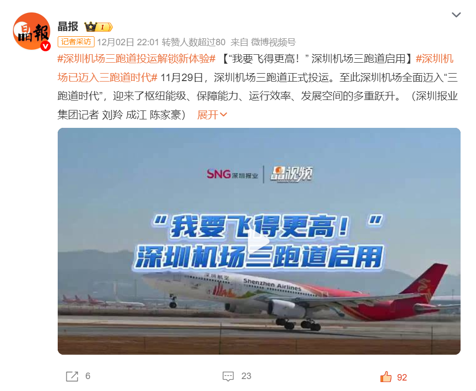 深圳三跑谈投产后,每新增1万架次航班拉动GDP增长18亿元,新增产值超百亿元。